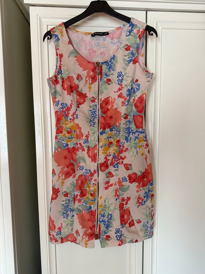 Önden fermuarlı, çiçek desenli kolsuz midi elbise. Yumuşak sentetik kumaştan, vücuda oturan bohem tarzda. Günlük kullanıma uygun.