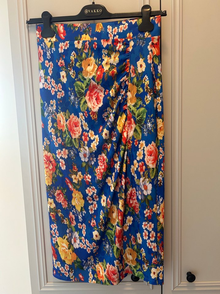 Drapeli ve çiçek desenli, koyu mavi sentetik kumaştan yapılmış, midi boy ve dar kesim eteği. Günlük kullanıma uygun bohem tarzda.