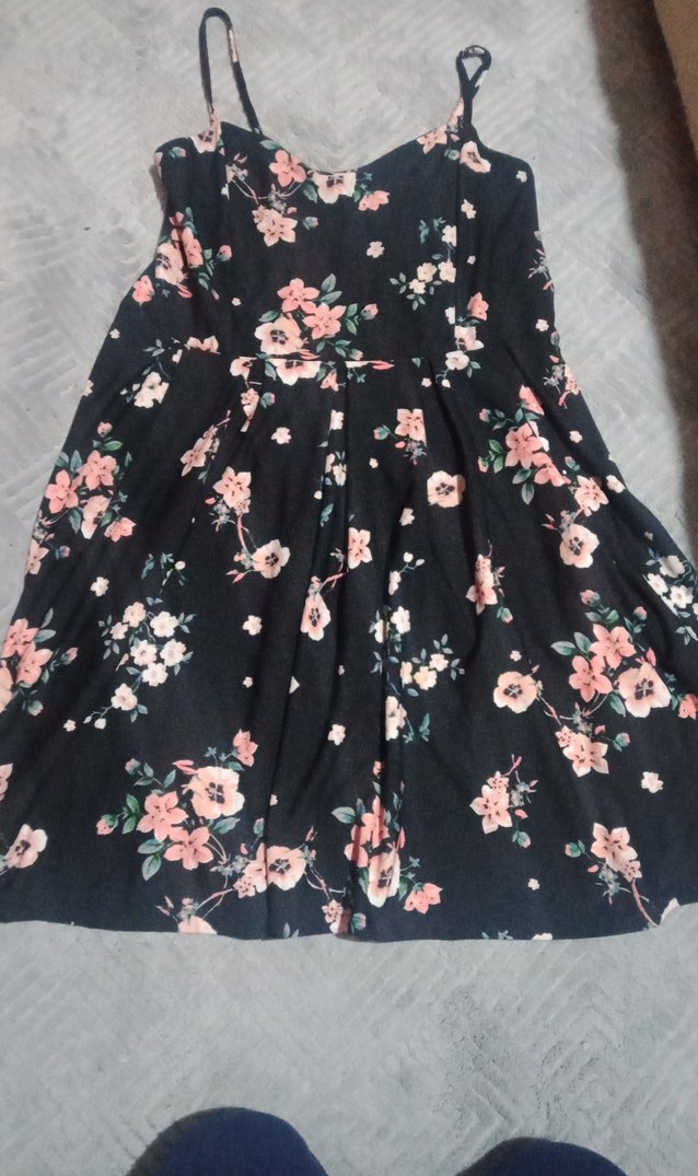 Siyah zemin üzerine pembe çiçek desenli, pileli ve bol kesim midi elbise, günlük şık görünüm için ideal.