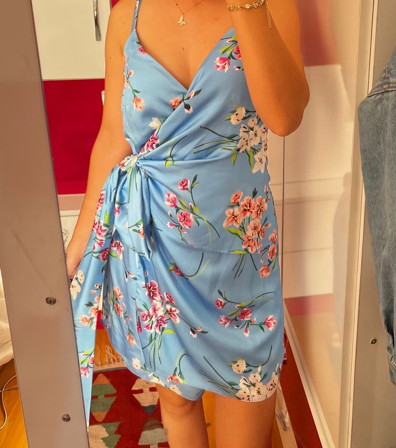 Mavi zemin üzerine çiçek desenli, ince askılı, kruvaze görünümlü elbise. Bel kısmı drapeli durduğu için vücuda çok güzel oturuyor. ✨ Marka: Trendyol ✨ Beden: 38 ✨ Askılı ve hafif kumaş ✨ Yazlık, iç göstermez ✨ Az kullanıldı, temiz durumda