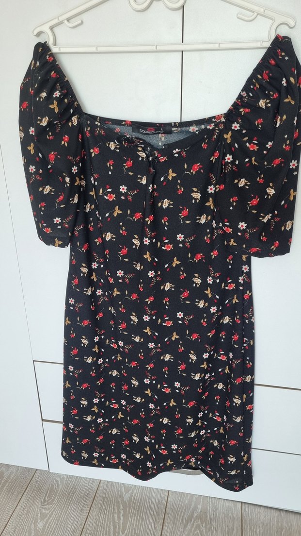 straplez yaka ve kısa kollu, çiçek desenli midi elbise. Koyu renk ve bohem tarzıyla romantik akşamlar için uygundur.