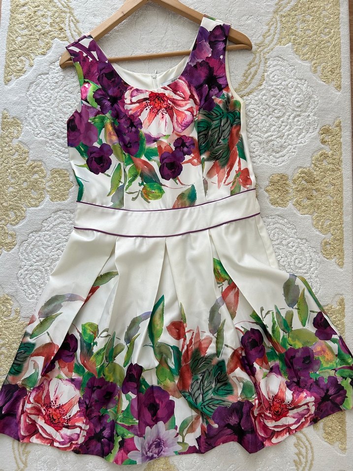 Çiçek desenli, kolsuz, straplez, pileli etekli, mor ve yeşil tonlarında, düğünler için uygun, vücuda oturan midi elbise.