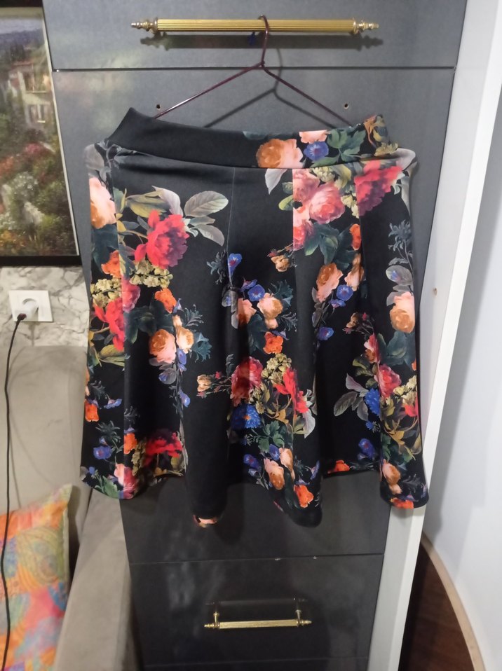 Çiçek desenli, drapeli ve bol kesim midi etek Koyu renkli sentetik kumaştan, Paris sokak modasına uygun günlük kullanım için ideal.