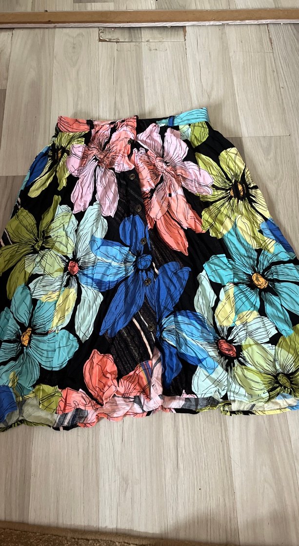 Yumuşak sentetik kumaştan, bol kesim, pile detaylı, koyu renkli çiçek desenli midi hamile eteği. Bohem tarzına uygun.