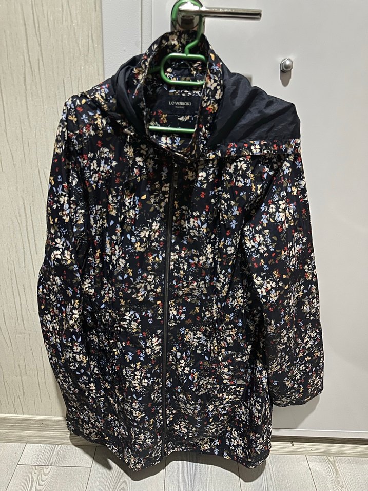 Bu kadın ceketi, koyu renkli çok renkli çiçek deseni, kesik yaka ve uzun kollara sahiptir. Rahat kesim ve ön fermuar ile günlük sokak tarzına uygundur.