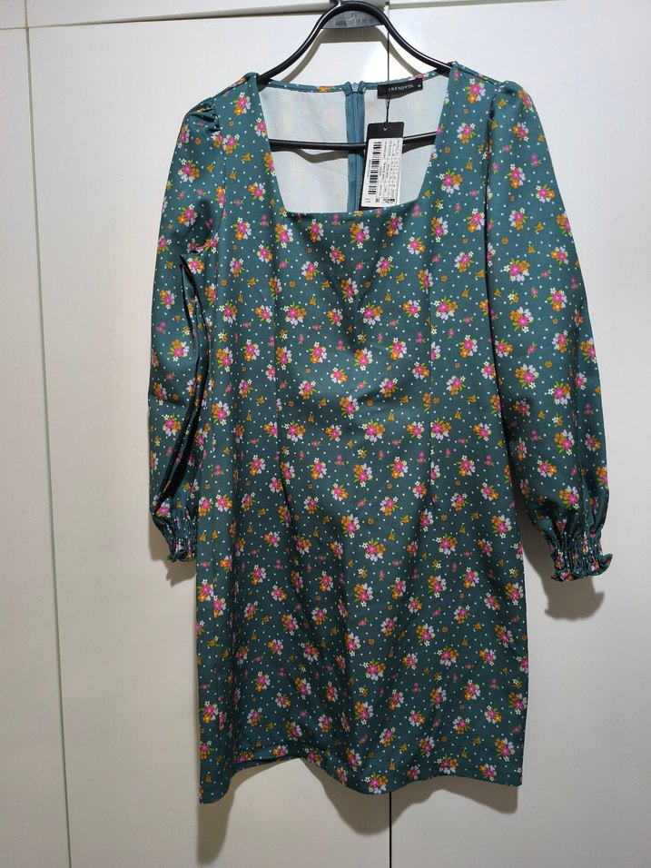 Çiçek desenli, uzun kollu, kare yaka, midi elbise. Vintage ve bohem tarzlar için uygun, koyu renkli çok renkli tasarım.