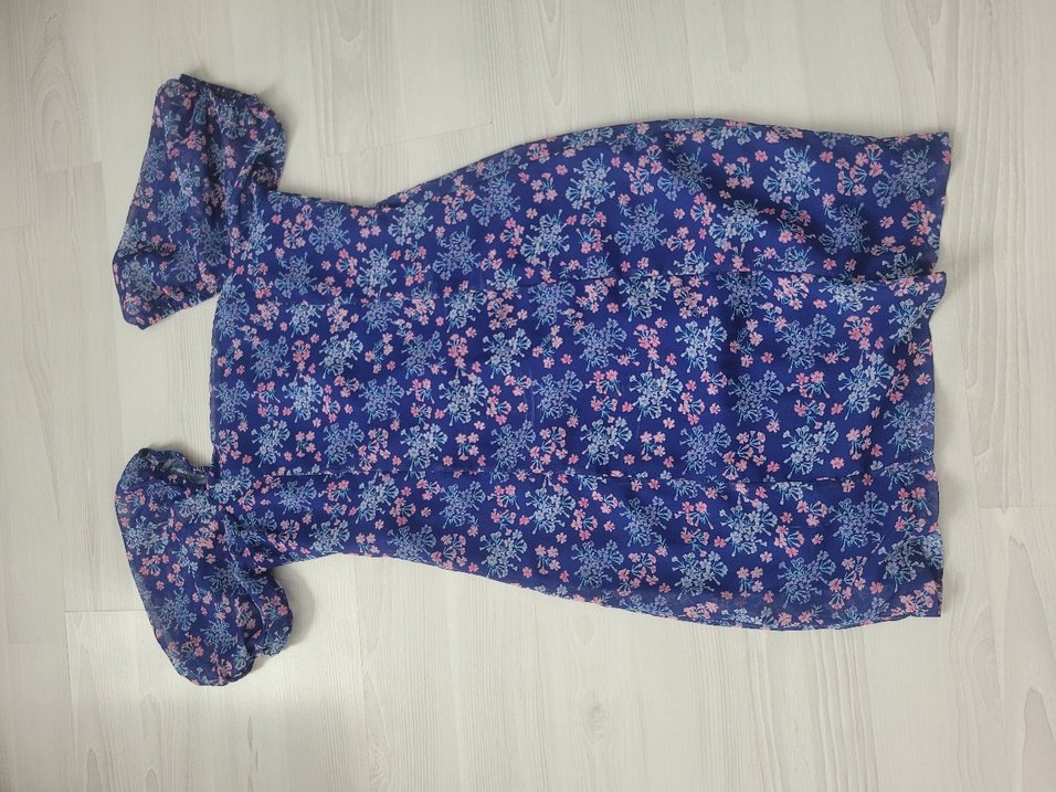 u yaka, kısa kollu, çiçek desenli lacivert midi elbise. Sentetik kumaştan, bohem tarzda