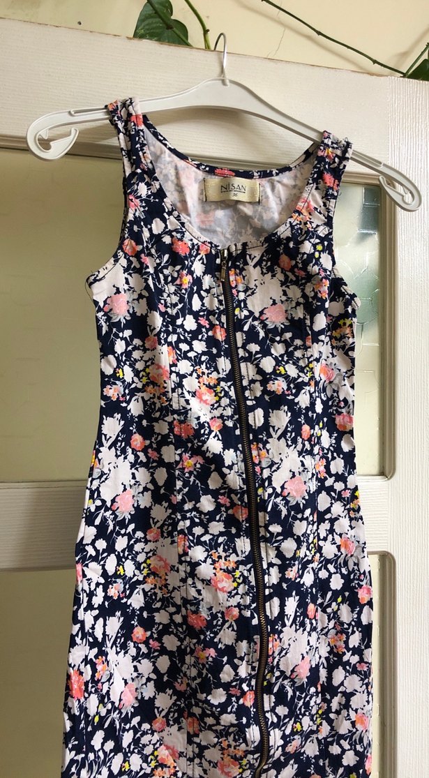 Kolsuz, önden fermuarlı, vücuda oturan midi elbise. Yumuşak sentetik kumaş, renkli çiçek desenli. Askısız yaka, bohem tarzına uygun.