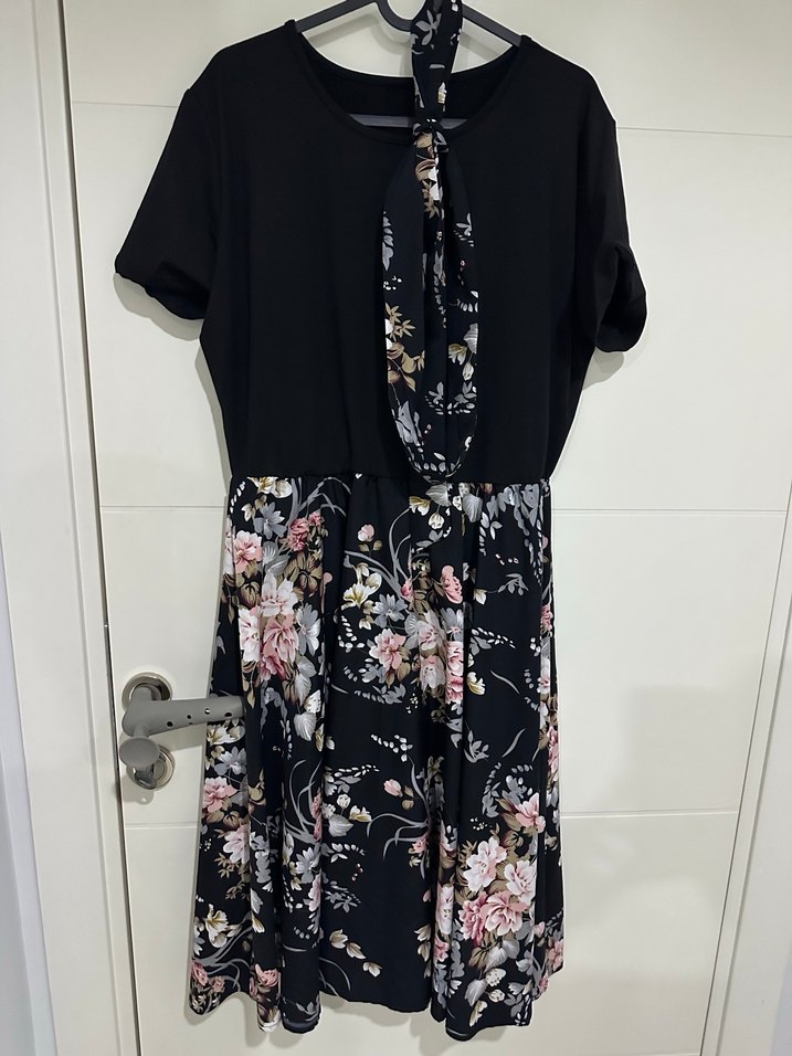 Kadınlar için midi boy, bol kesim, kısa kollu ve halter yaka elbise. Siyah üst kısmı ve çiçek desenli etek kısmı ile kemer detaylıdır. Ofis için uygun, bohem tarzda. Sadece 1 kez giyildi
