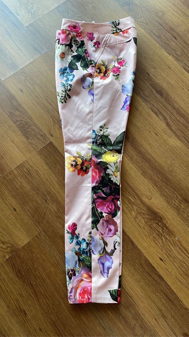 Kadınlar için çiçek desenli, pastel renklerde, normal boy midi kumaş pantolon. Regular kesim ve fermuarlı detaylara sahip, günlük sokak stili için uygun.