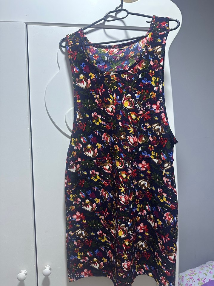 Kolsuz, drapeli ve çiçek desenli midi elbise, koyu renkli sentetik kumaştan, günlük kullanım için bohem tarzda.