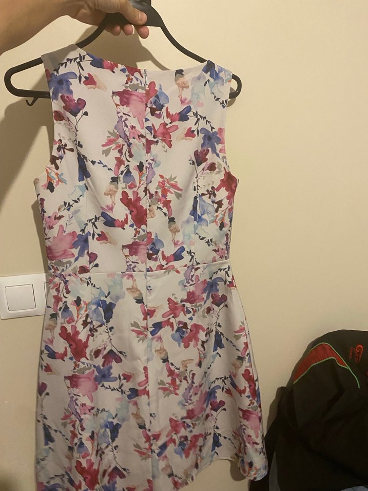 Kolsuz, yakalı ve drapeli tasarıma sahip midi elbise. Yumuşak sentetik kumaştan, pastel tonlarda canlı çiçek desenli, şık ve modern görünümlü. S beden 36 2 kere düğünlerde giydim tertemiz