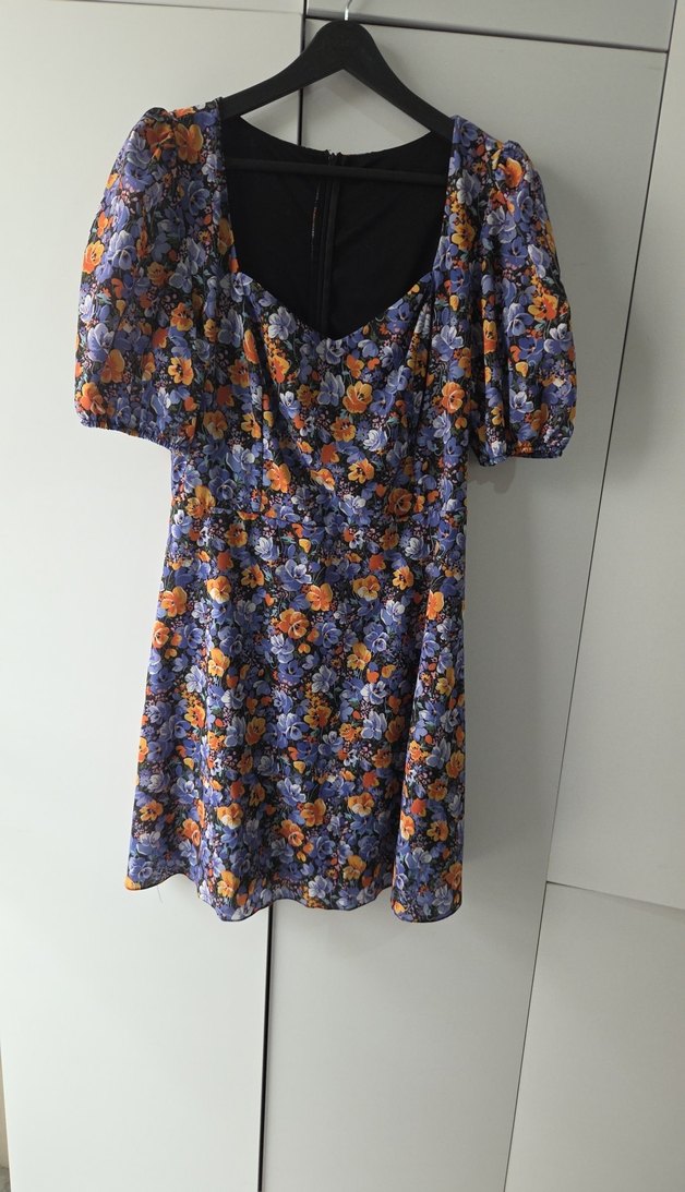 Bol kesim midi elbise, V yaka ve kısa kollu, drapeli tasarıma sahip. Koyu renkli çok renkli çiçek deseniyle vintage tarzda günlük kullanım için uygun.