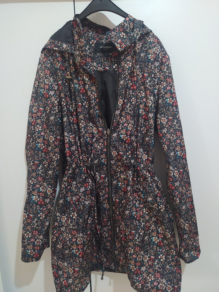 Çiçek desenli, fermuarlı, uzun kollu, midi boy, yağmurluk /trençkot. Notlu yaka ve çok renkli koyu zemin üzerine baskılıdır. Büzgülüdür kolları v beli ayarlanabilir .Kullanılmadı