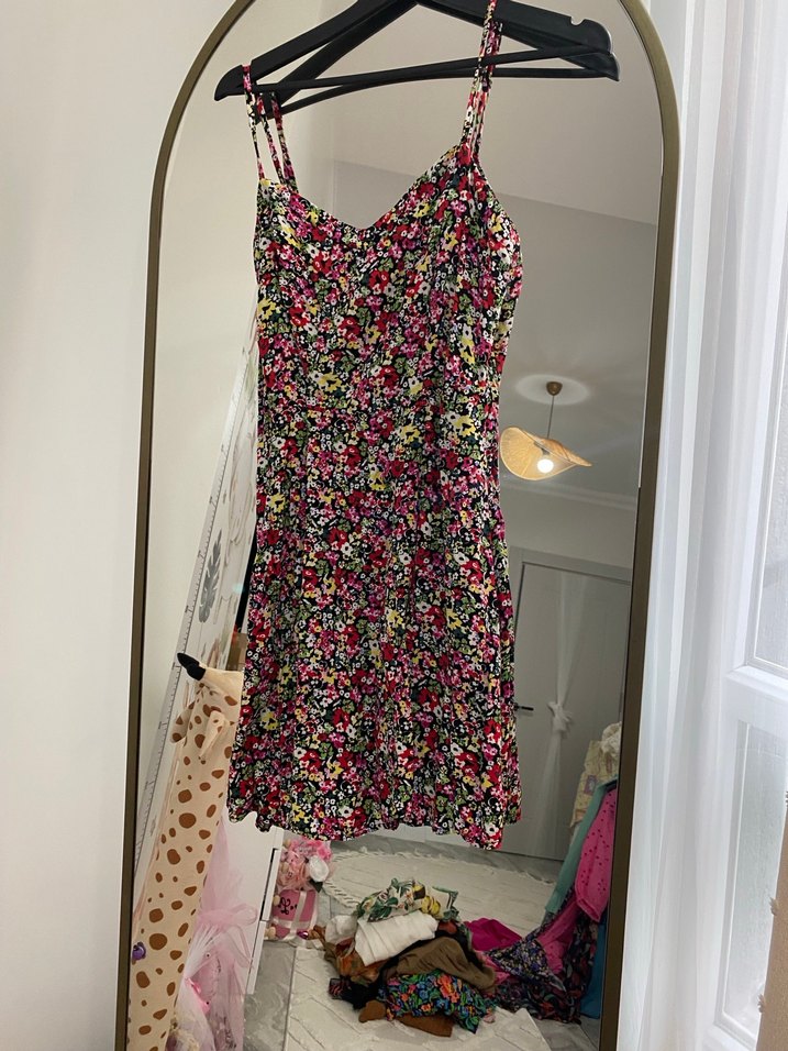 Dar kesim mini elbise, askılı ve straplez yaka tasarımına sahiptir. Canlı çiçek desenli, düğmeli ve sentetik kumaştan üretilmiştir. Günlük kullanıma uygundur.