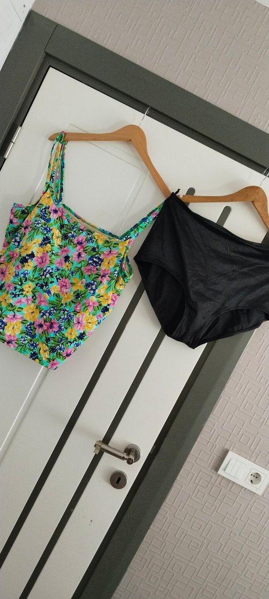 Çiçek desenli, askılı ve bol kesim üstü ile siyah düz alt parçalı, renkli ve vintage tarzda kadın mayo. üst en 50 boy 60 cm likralit yurtdışı urunudur