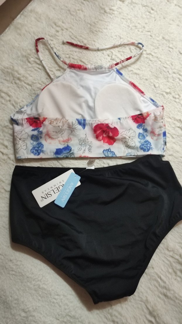 Çiçek desenli, kolsuz ve mini üst ile yüksek bel düz alt bikini. Plaj için bohem tarzda.