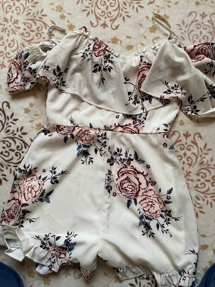 Dar kesim, straplez kadın tulum kısa kollu ve fırfırlı detaylara sahiptir. Yumuşak sentetik kumaştan yapılmış, açık beyaz zemin üzerine çiçek desenlidir, bohem tarz için uygundur.