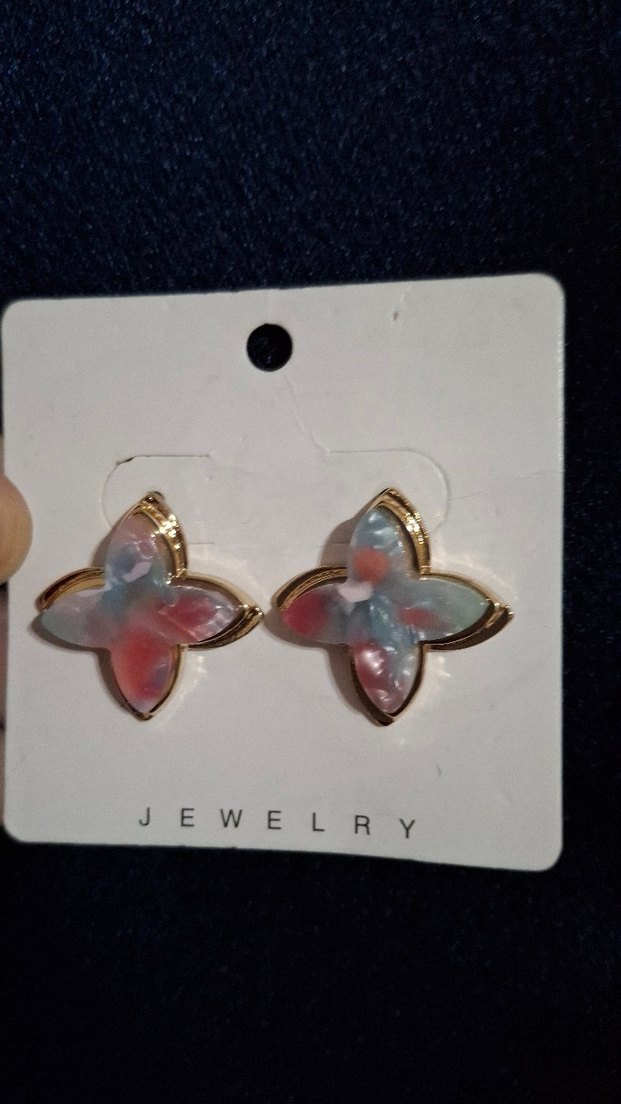 Parlak yüzeyli, çok renkli mini çiçek desenli küpeler, günlük kullanıma uygun.