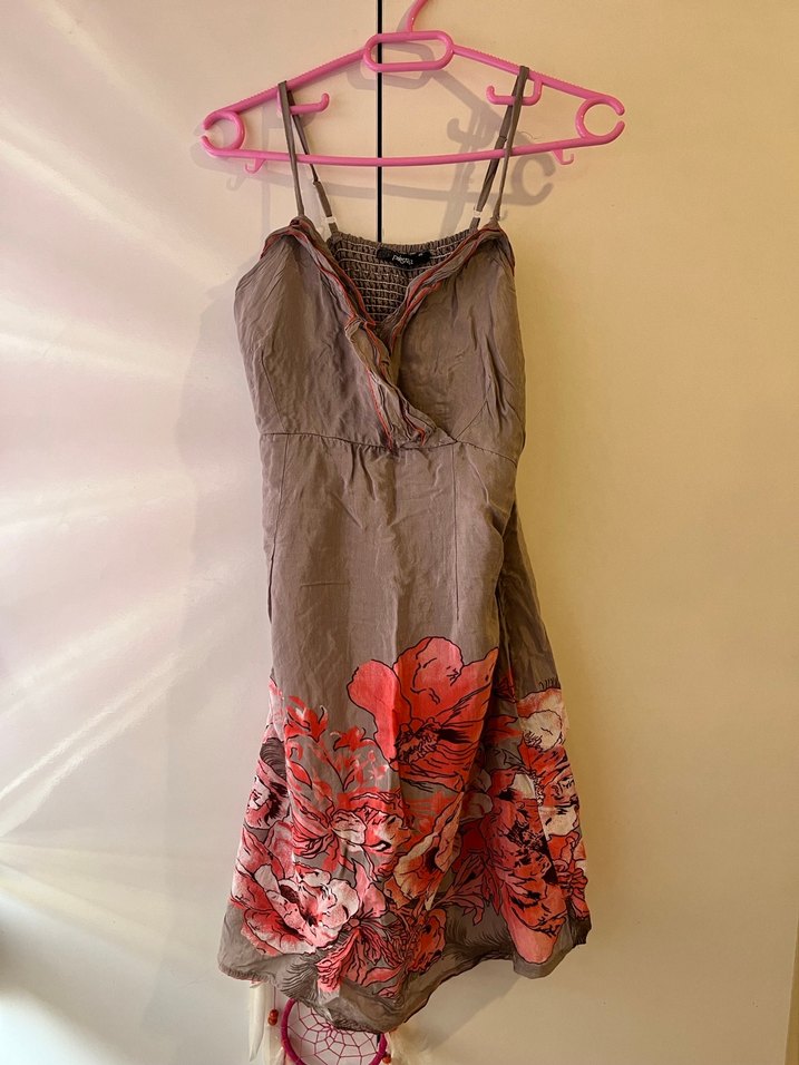 Gri renkli, şeffaf detaylı, çiçek desenli mini elbise. Yumuşak sentetik kumaştan yapılmıştır, romantik akşamlar için uygundur.