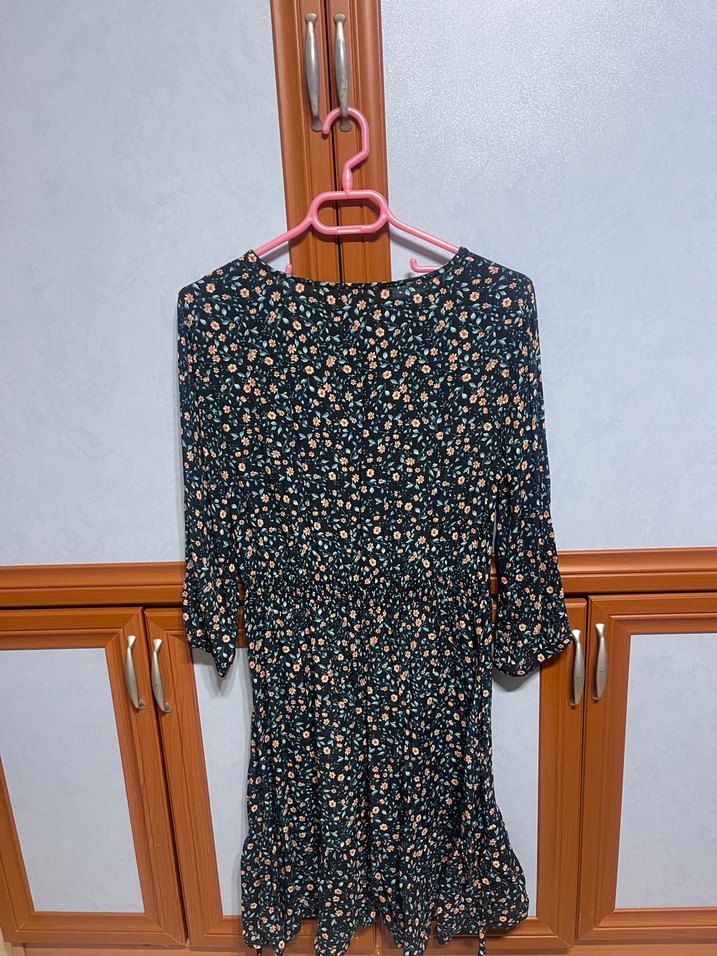 Günlük mini elbise, yarım kol. Yumuşak kumaş üzerine koyu renk çoklu çiçek desenli ve fırfır detaylıdır.