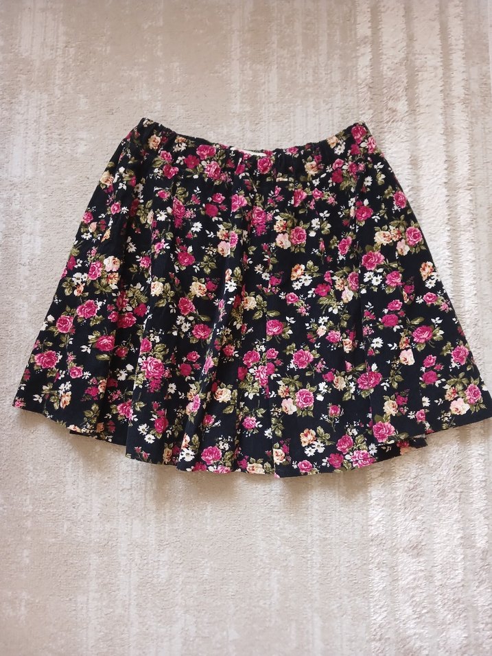 Renkli çiçek desenli, bol kesim ve fırfırlı mini etek, bohem tarzı için uygun. beli lastikli astarlı yeni gibidir bel 34 cm boy 40 cm
