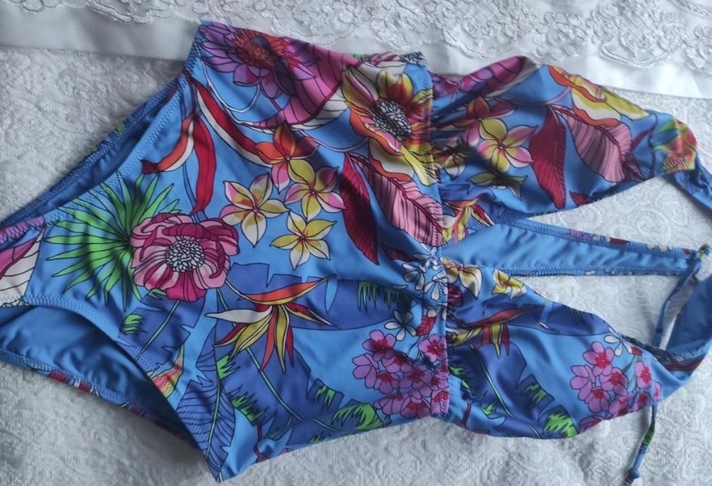 Renkli çiçek desenleri ve fırfır detaylı, askılı kısa kesim, bohem tarzda kadın mayo.