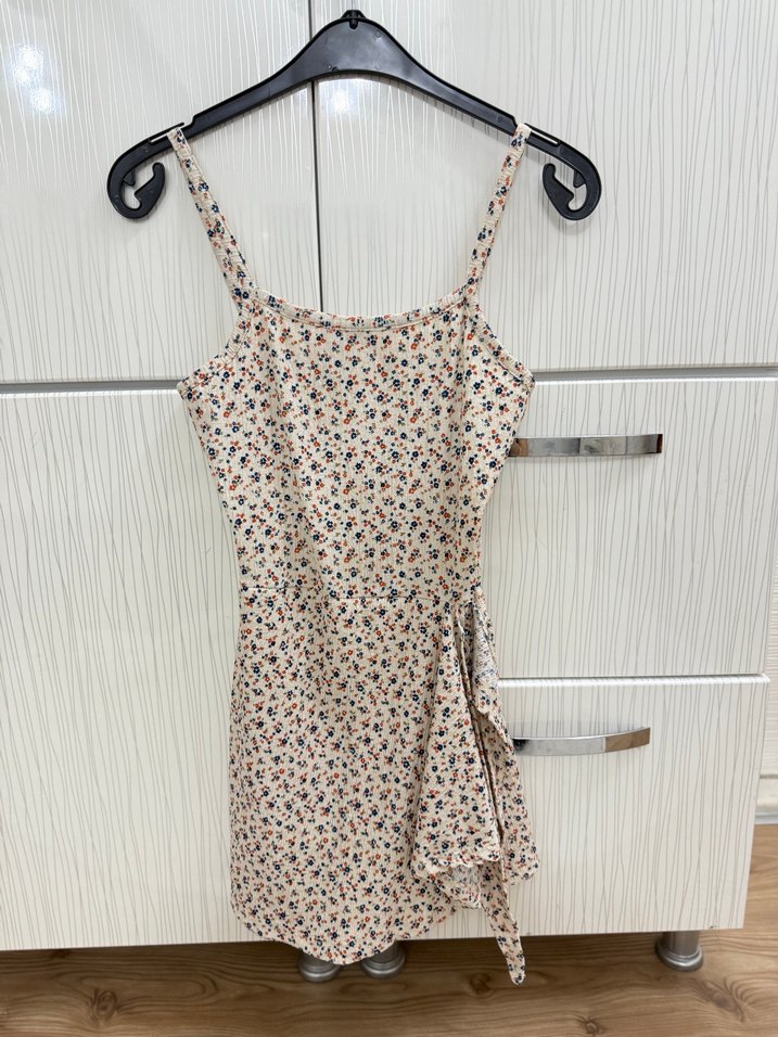 İnce askılı, çiçek desenli ve drapeli mini elbise, yumuşak sentetik kumaştan, bohem tarzını yansıtır. Yandan baglamalı yazın bi kaç kez giydim sadece Baglama yerinde minik bi acılma var sadece