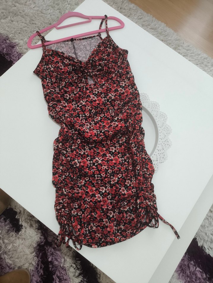 İnce askılı, straplez yakalı ve drapeli detaylı, koyu renk çok renkli çiçek desenli, vücuda oturan mini elbisedir. Yumuşak sentetik kumaştan üretilmiştir.