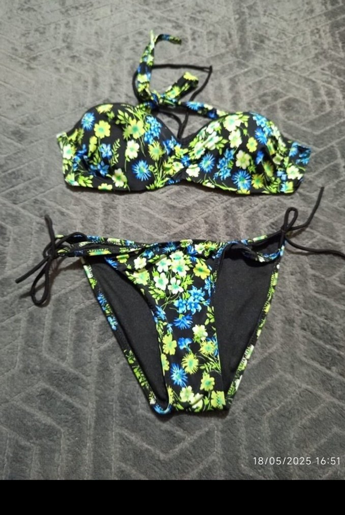 Çiçek desenli, mini kesim ve ipli detaylara sahip, dantel süslemeli, sıkı oturan bikini takımı. Plajda bohem tarzı yansıtır.