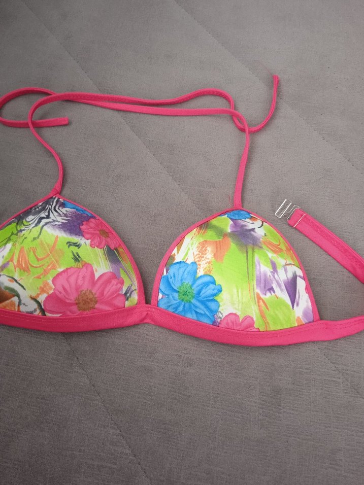 Canlı pembe askıları ve renkli çiçek desenleriyle kısa mini bikini üstü. Bohem ve karşı kültür tarzını yansıtıyor.