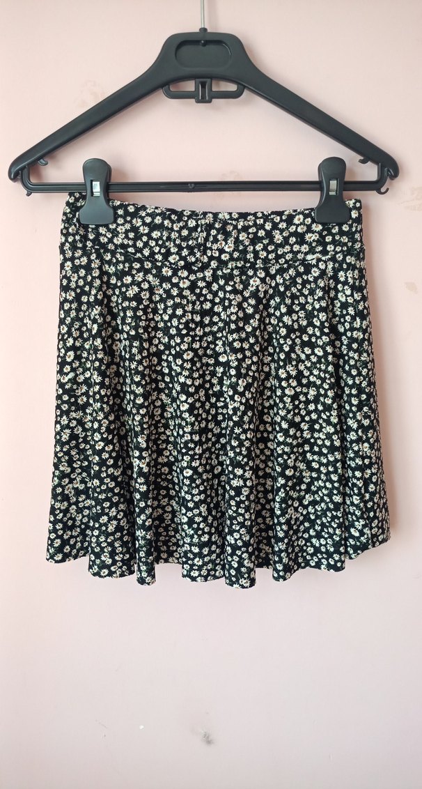 Siyah mini etek, pileli ve bol kesim olup çiçek desenlidir. Yumuşak sentetik kumaştan üretilmiştir.