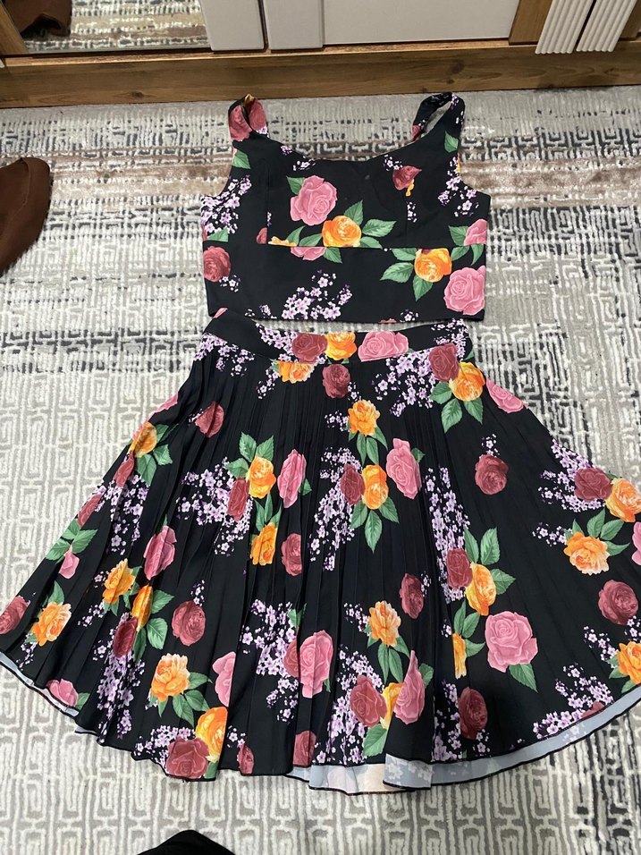 Koyu renkli çok renkli çiçek desenli, piliseli, kolsuz, mini boy sentetik kumaştan yapılmış, vintage bohem tarzda, dar kesim ikili takım elbise.