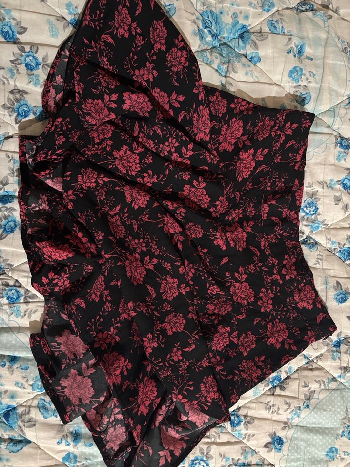 çiçek desenli mini etek, bol kesim ve drapeli tasarıma sahiptir. Romantik akşamlar ve günlük kullanım için uygundur.