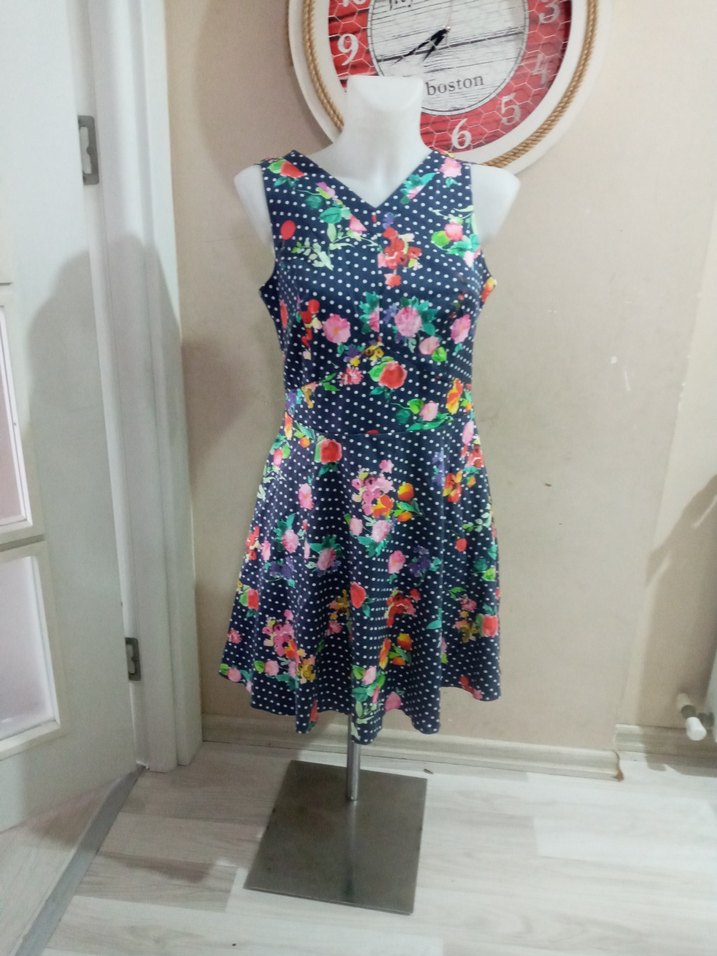 Kolsuz, V yaka mini elbise, renkli çiçek desenli ve küçük puantiyeli. Düğmeli ve vücuda oturan kesimiyle günlük kullanıma uygun.