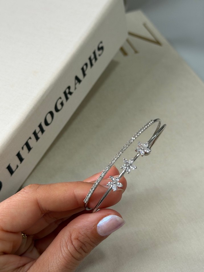 Kadınlar için minimalist tasarımlı, boncuk detaylı, beyaz ve gri tonlarında çiçek desenli bilezik. Düğünler ve şık anlar için uygun.