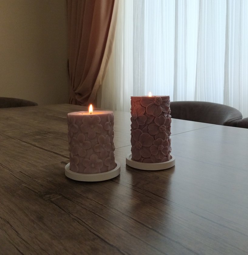 Çiçek desenli mum, beyaz tabanlarda, sıcak bir ortam yaratır. ️Tekli fiyatıdır, tabanıyla beraber gönderilecektir. İstediğiniz renkler ve belirli kokularda kişiselleştirilebilir.