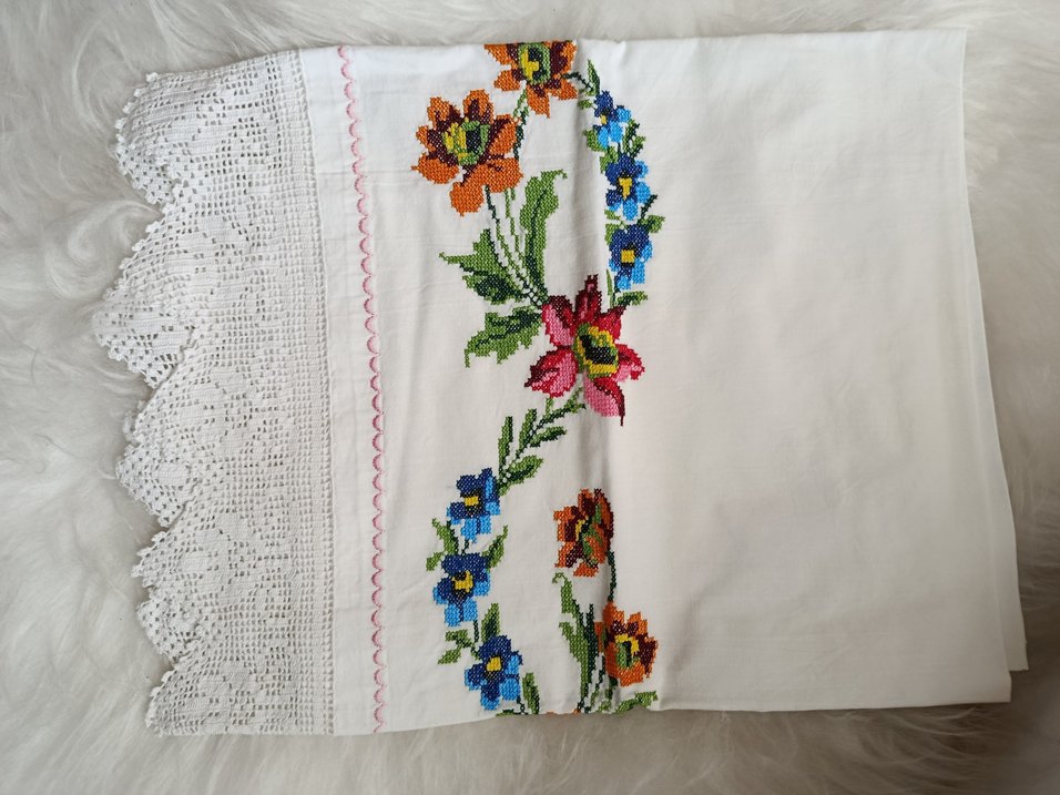 Renkli çiçek nakışları ve ince tığ işi dantel kenarıyla el yapımı, geleneksel işçilikte yastık kılıfı