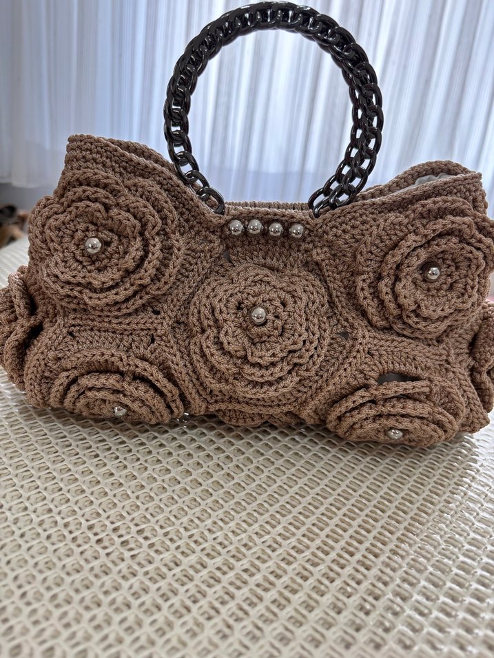 Bej renkli, çiçek motifli örgü kadın çantası, boncuk detaylı ve sağlam gri saplı, rahat bohem tarzını yansıtıyor. İstediğiniz renkte örülür.