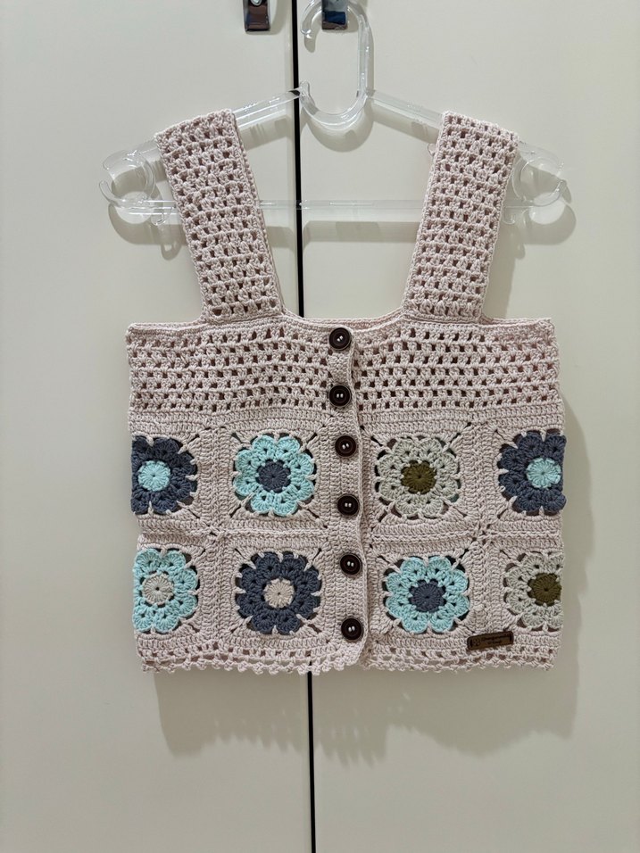 Düğmeli, askılı straplez yaka ve gevşek kesime sahip örgü yelek. Pastel tonlarda çok renkli çiçek desenleriyle bohem tarzı yansıtıyor.