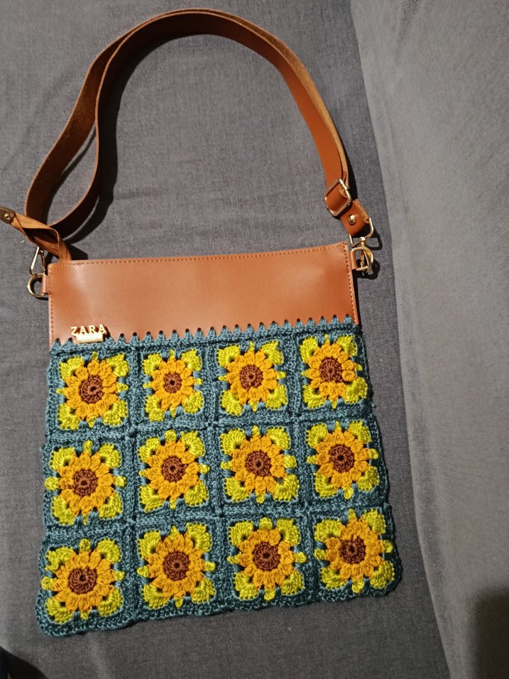 Çiçek desenli renkli örgü kadın çantası, tokalı deri askısı ile bohem tarzda günlük kullanıma uygun.