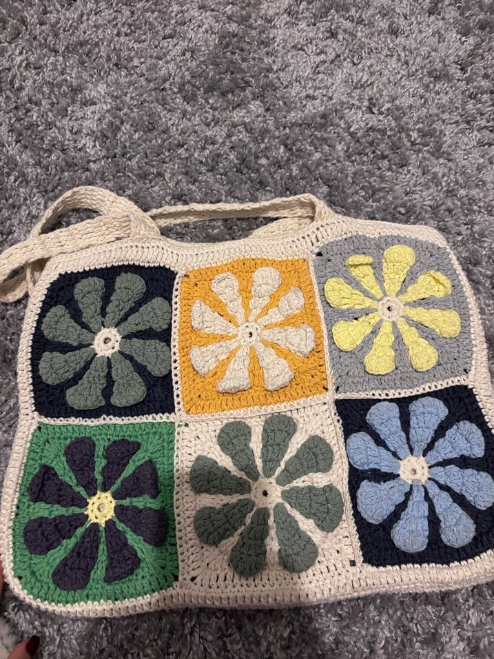 Bu bohem tarzı kadın çantası, yumuşak gri zemin üzerinde çok renkli çiçek desenleriyle örülmüştür. Rahat ve retro bir görünüm sunar, günlük kullanım için uygundur.Tamamen el örmesidir
