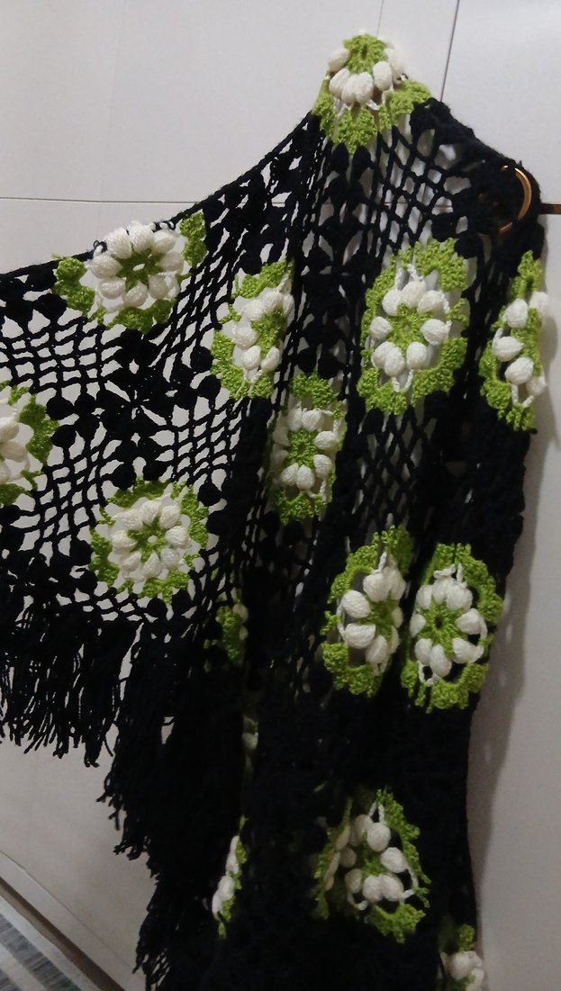 Çiçek desenli dantel detaylı, püsküllü koyu renkli çok renkli örme bohem kadın şalı.