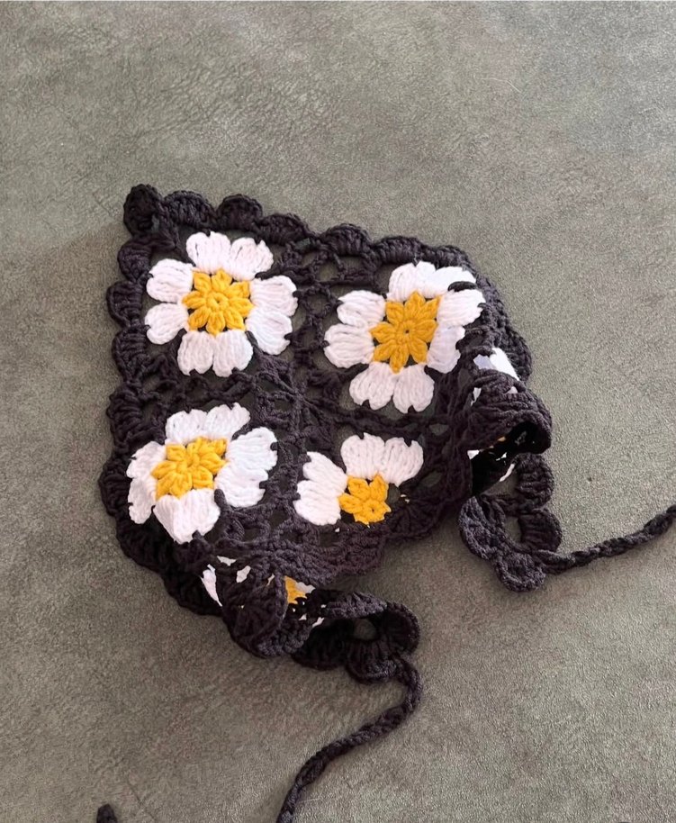 Koyu renkli, çok renkli örgüden yapılmış, çiçek desenli bohem tarzda saç aksesuarı. Yumuşak örgü kumaş, retro ve hippie havası taşır.