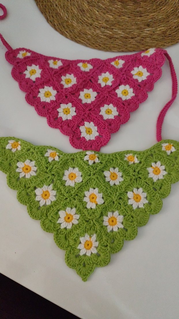 Canlı pembe ve yeşil renklerde, dantel detaylı örgü bohem tarzda papatya desenli saç aksesuarları bandana