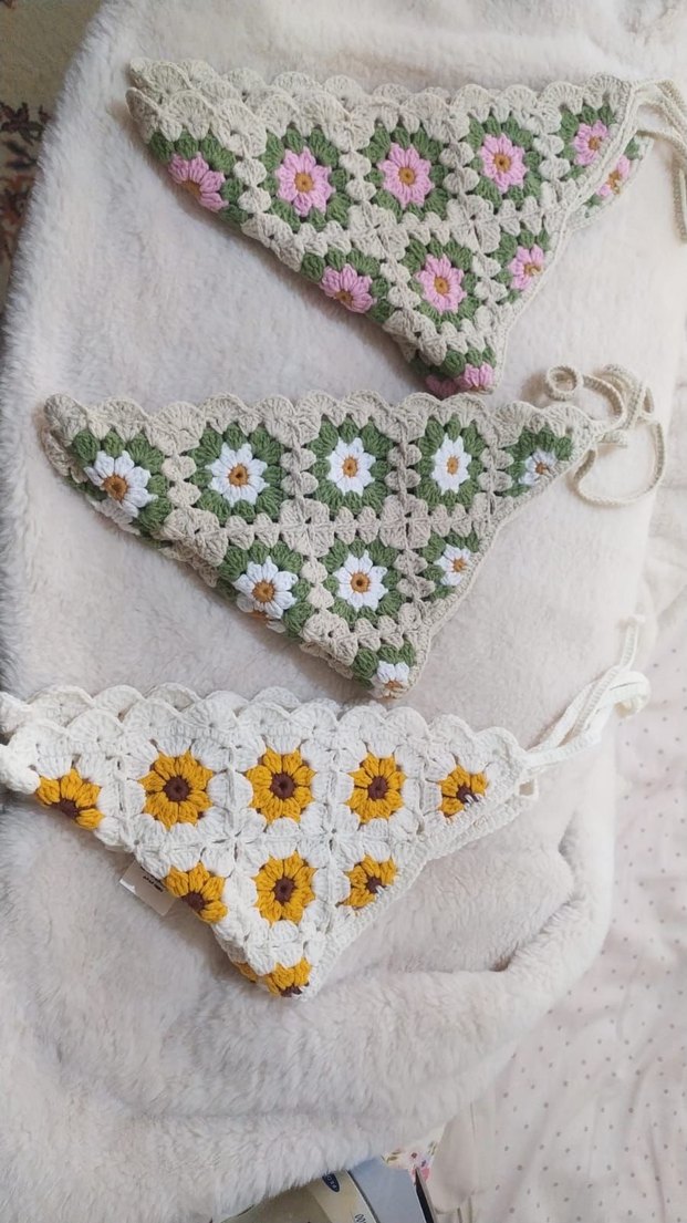 Pastel çiçek desenli, örgü bohem tarzda, rahat ve retro hippie görünümlü saç aksesuarları. Adet fiyatıdır