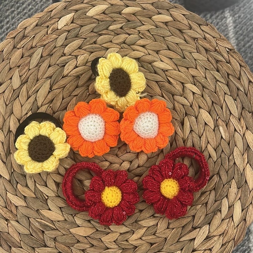 Renkli, çiçek desenli örgü çocuk saç tokaları. Bohem ve retro tarzıyla dikkat çeker.