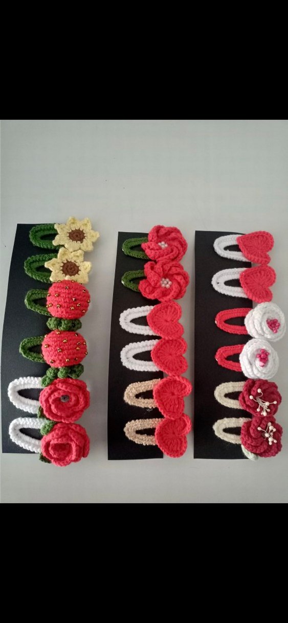 Renkli, çiçek ve kalp desenli örgü çocuk saç tokası seti. Kırmızı, beyaz ve yeşil tonlarında şık tasarım. Çifti 80TL