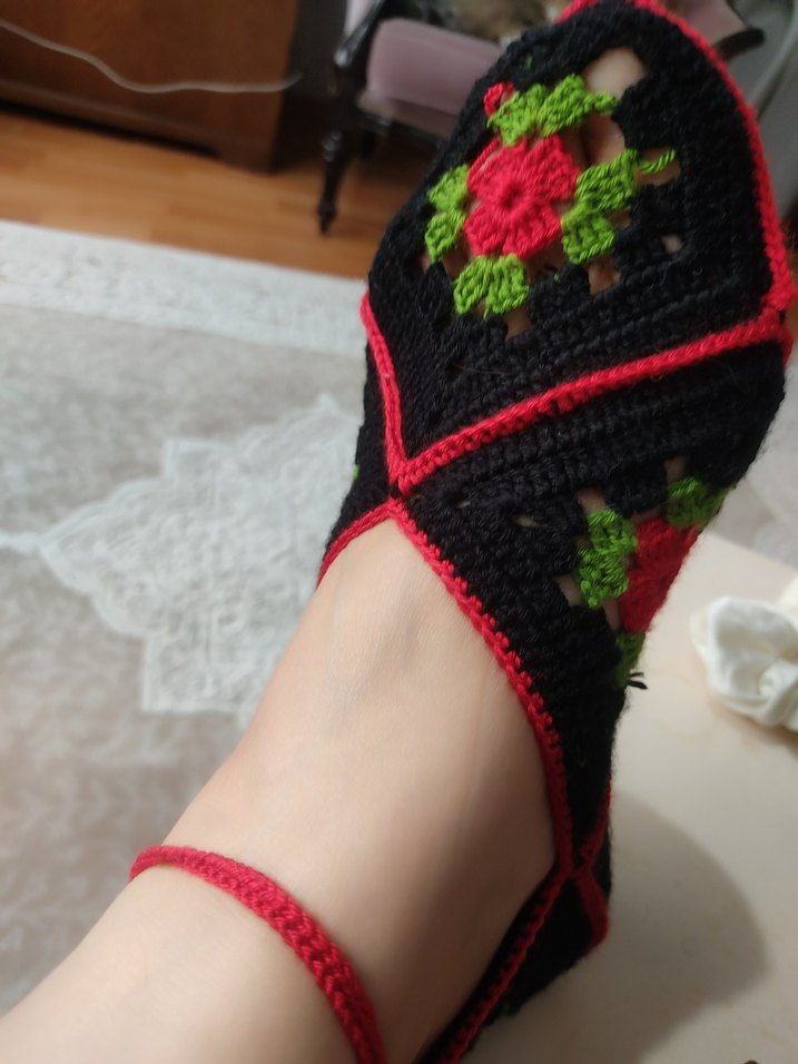 Kadın terlikleri, stiletto topuklu ve örgü malzemeden üretilmiştir. Koyu renkli çok renkli çiçek desenine sahiptir. Günlük kullanıma uygun bohem ve rahat bir stile sahiptir.