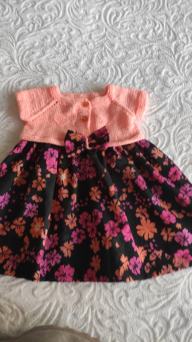 Kız çocuk elbisesi, kısa kollu pembe örgü üst ve renkli çiçek desenli bol etek ile bohem tarzda tasarlanmıştır.